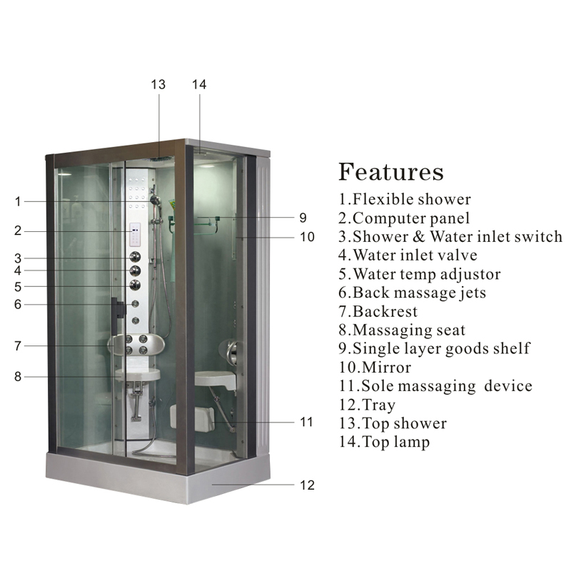 细胞排水器,无声双滑块,门把手,双层货架,顶喷,升降杆,花洒,花洒软管,水龙头,12个雾化喷嘴,2个靠背,2个固定座位,足底按摩,电脑,臭氧,顶灯,音箱,风扇,2套4珠背景灯,蒸汽出口