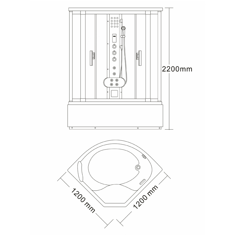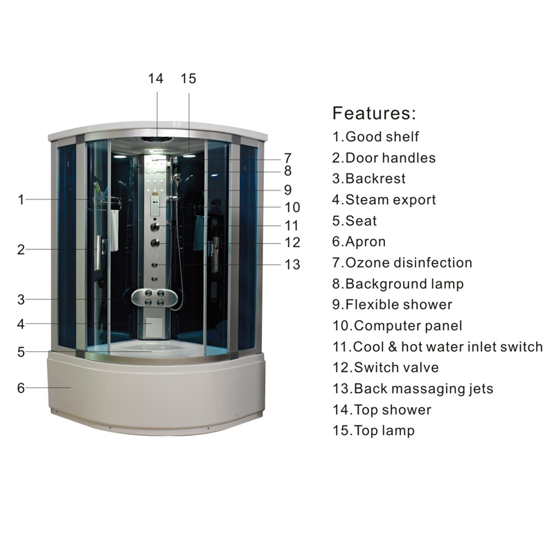 包含:弹跳去水,门滑轮,双门把手,单层置物架,顶喷,升降杆,花洒,花洒软管,水龙头,6个雾化喷嘴,靠背,电脑,臭氧,顶灯,风扇,音响,4个背景灯,蒸汽出口